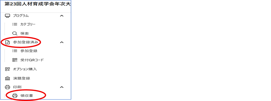 参加登録完了後、ステータスは参加登録済みに変わります。領収書をクリックして領収書のダウンロードが可能です。 |